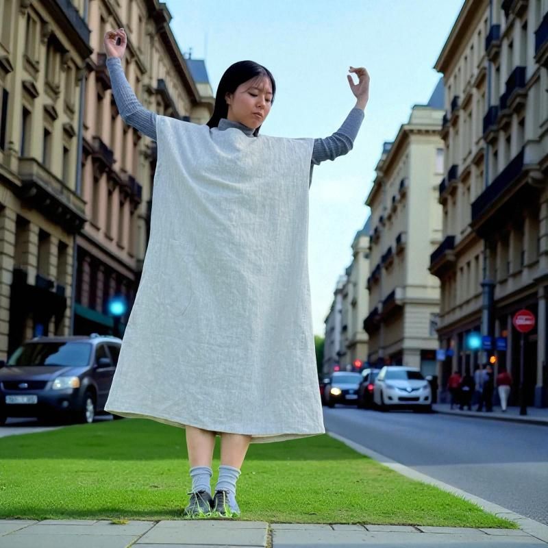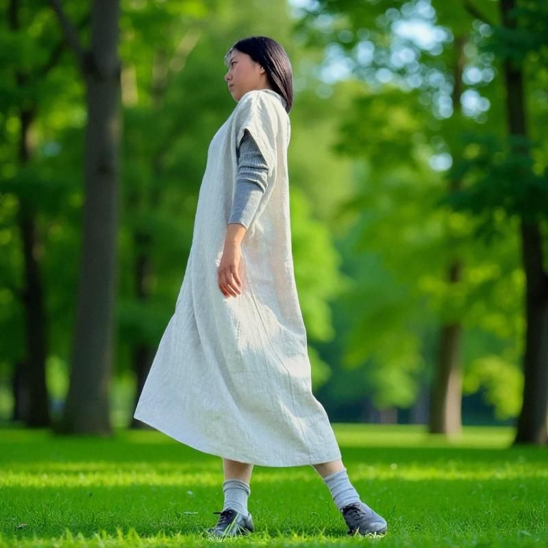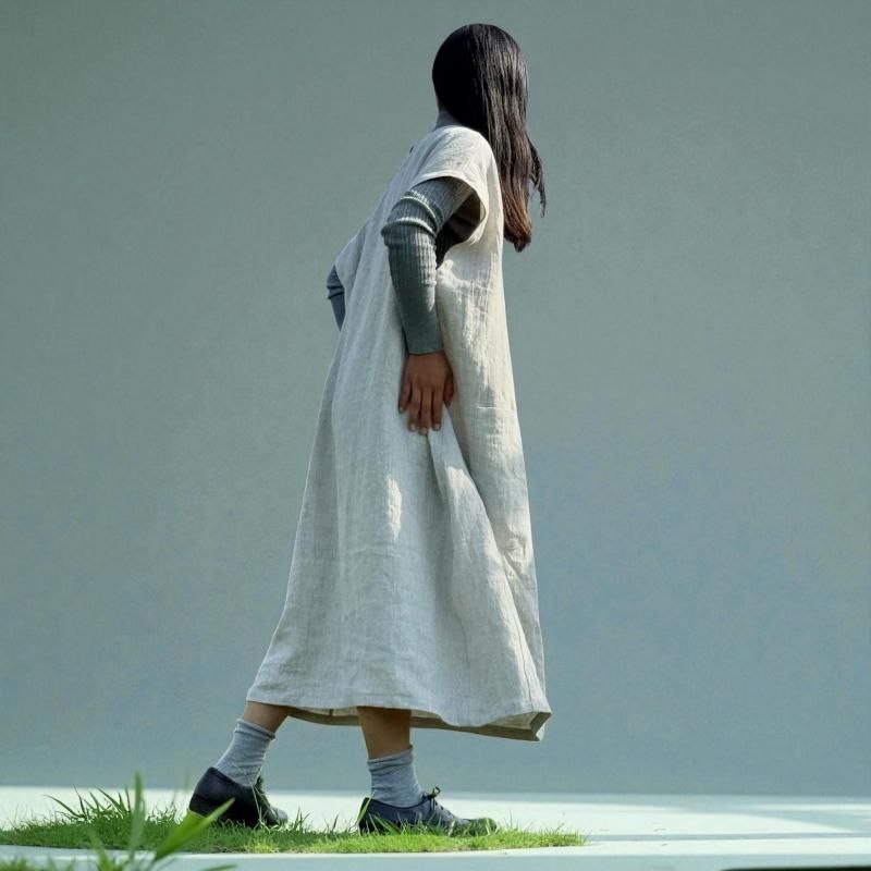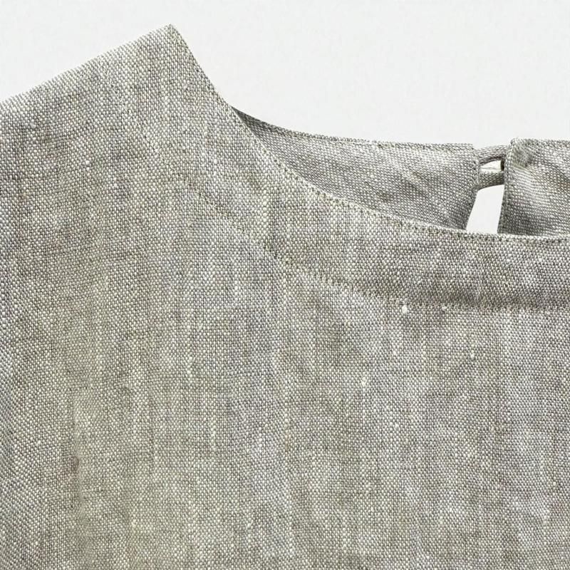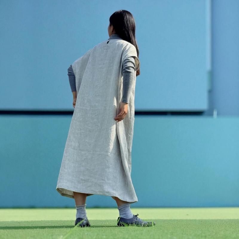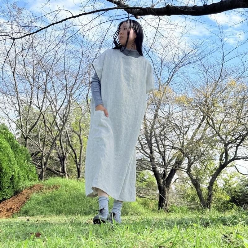 私のワンピースは、あえて重ね着を前提に、袖ぐりにゆとりを持たせました。中にTシャツやブラウス、タートルネックなどを着ても、もたつくことなく、すっきりとした着こなしを楽しめます。