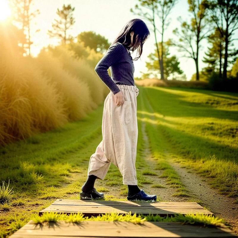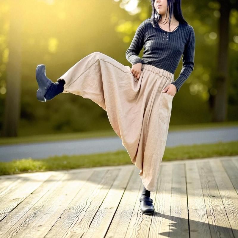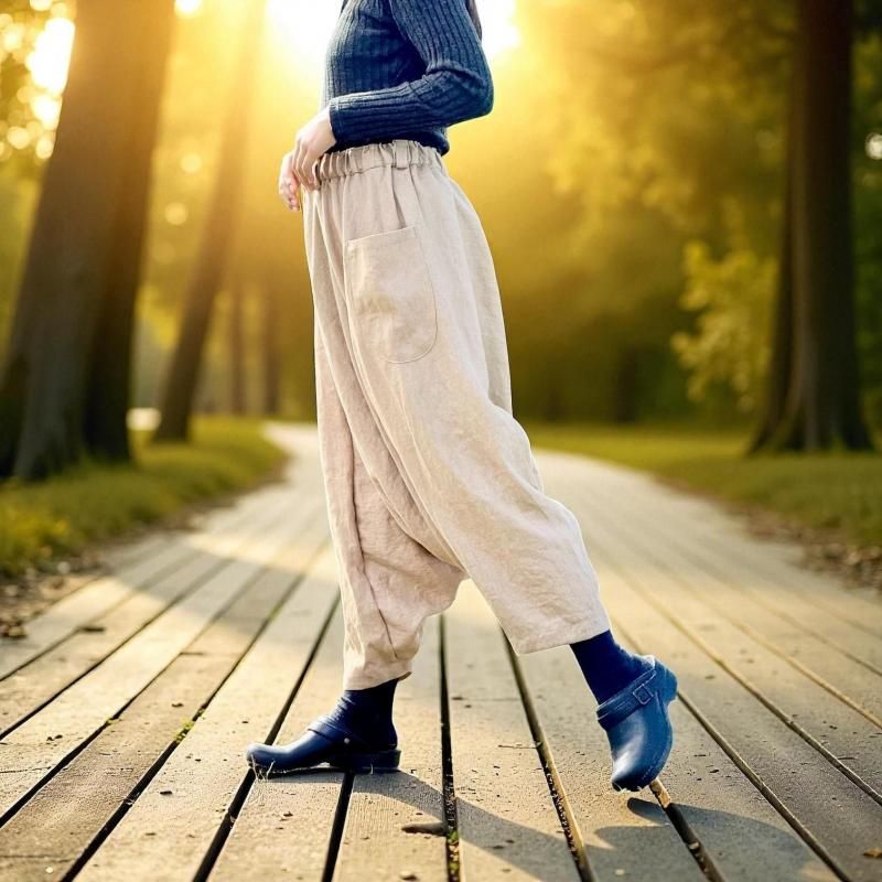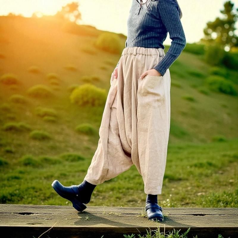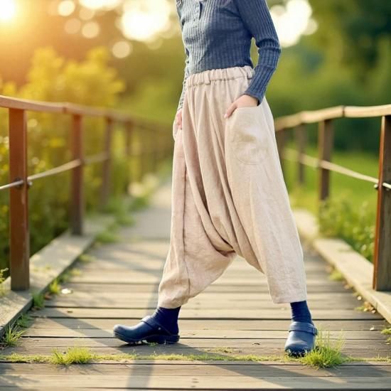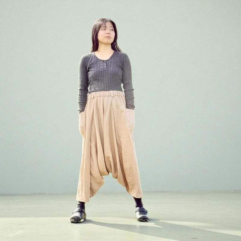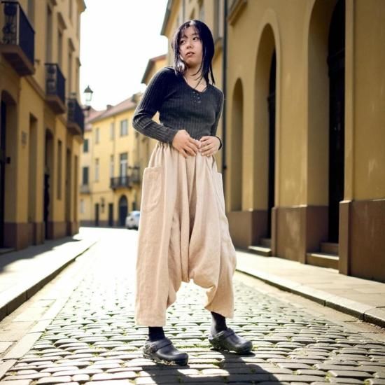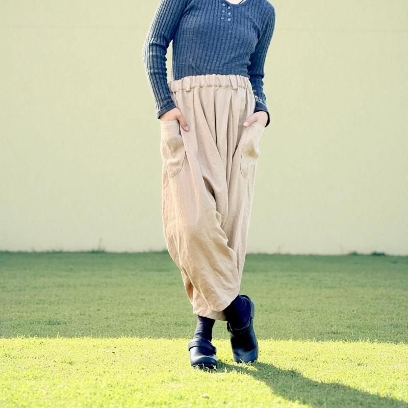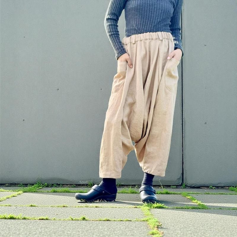 暑い夏も寒い冬も、この一着で快適に過ごせる。それがこのサルエルパンツの最大の魅力です。