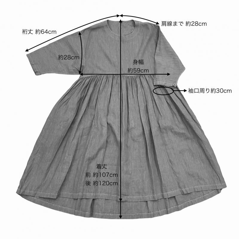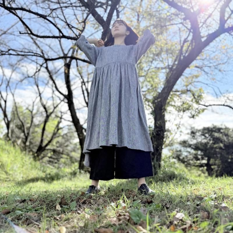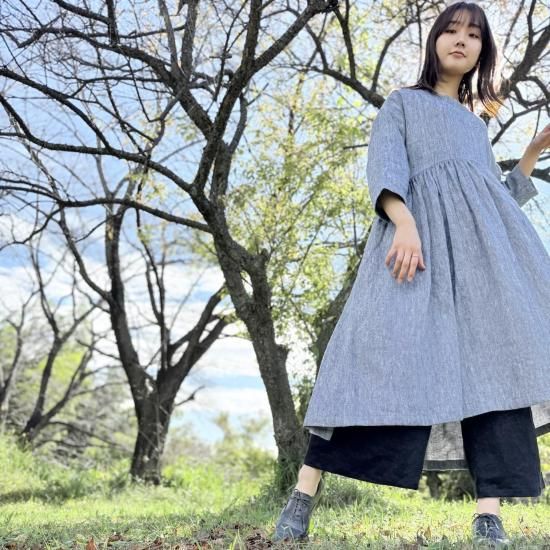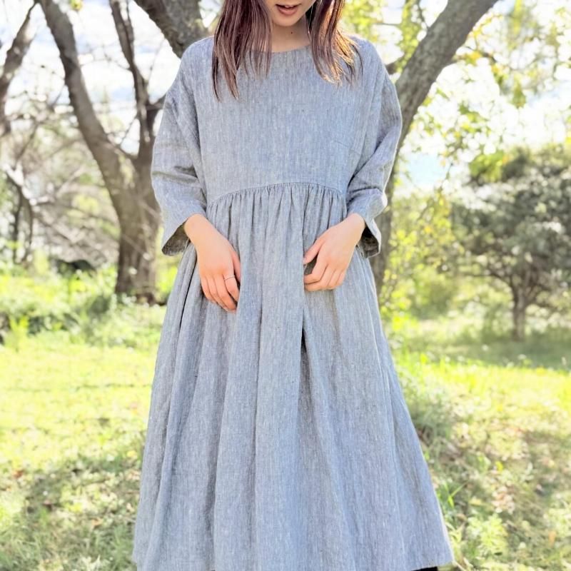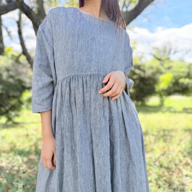 身幅とアームホールはたっぷり、袖はあえてギャザーを配さず、可愛くなり過ぎない大人のギャザーワンピースに仕上げました。