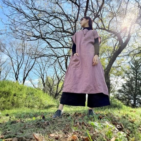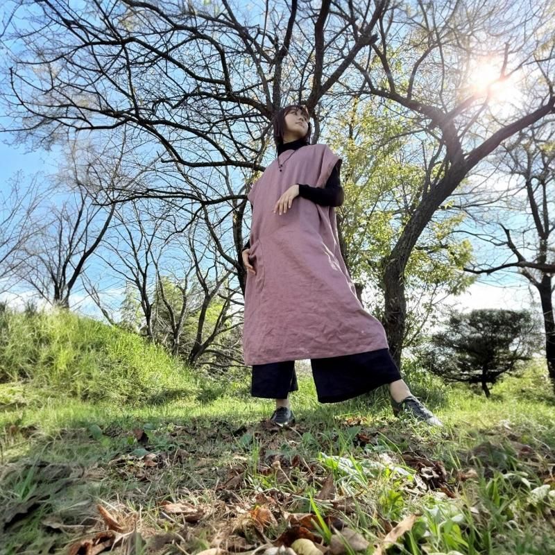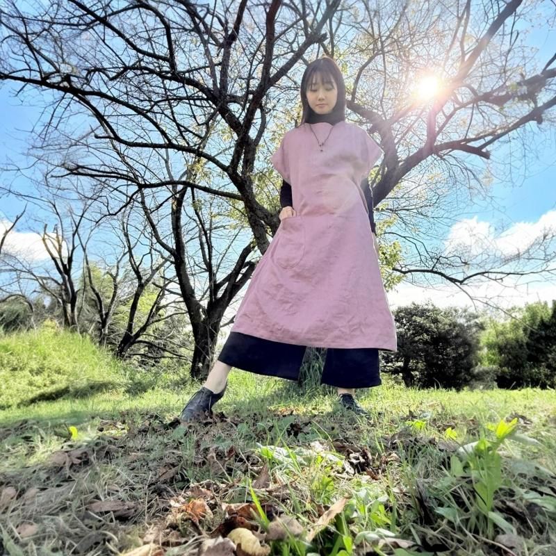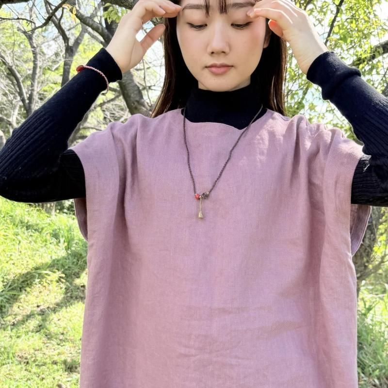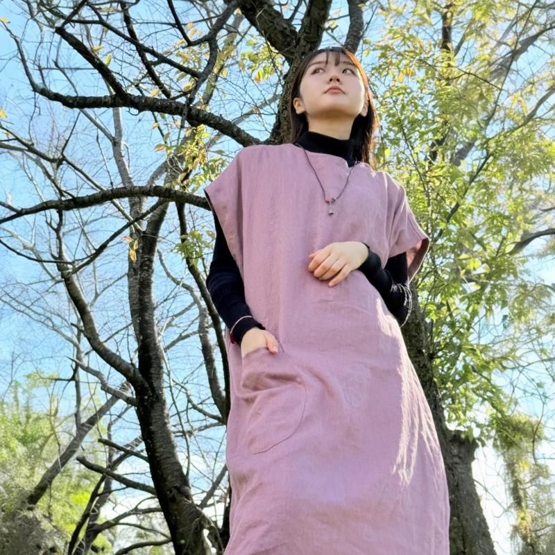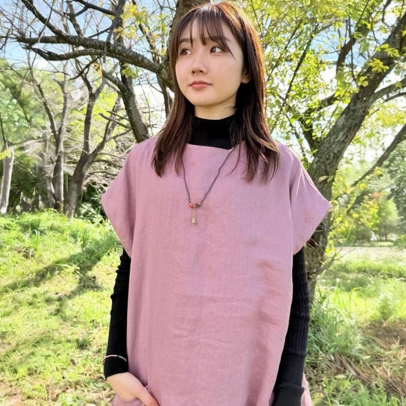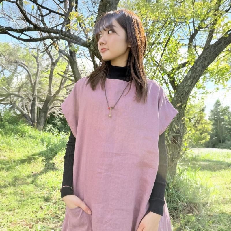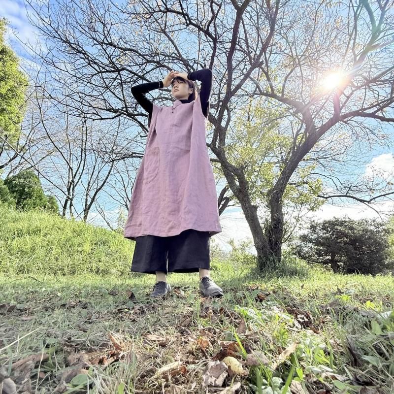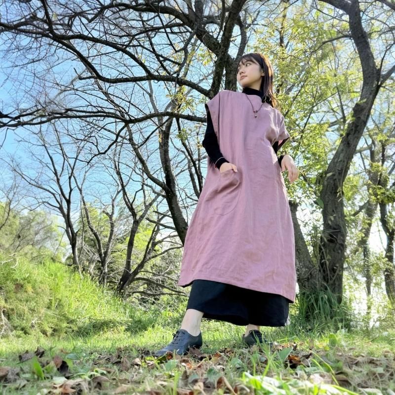 私のワンピースは、あえて重ね着を前提に、袖ぐりにゆとりを持たせました。中にTシャツやブラウス、タートルネックなどを着ても、もたつくことなく、すっきりとした着こなしを楽しめます。