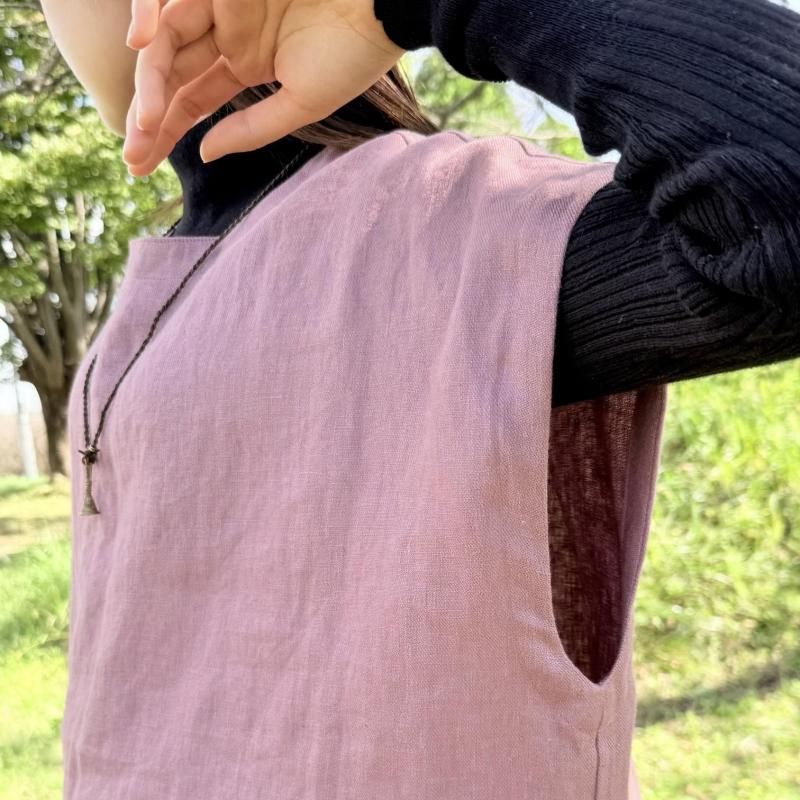 夏はタンクトップの上から来て涼やかに、冬は厚手のセーターに重ねてもスッキリ見えます。