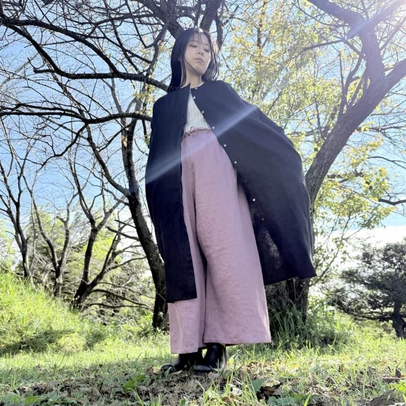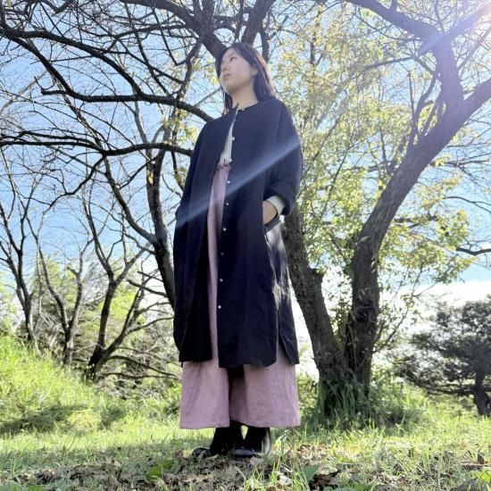 セットアップ:ノーカラーロングシャツワンピース フレンチリネン ブラック+タイパンツ フレンチリネン アンティークローズ
