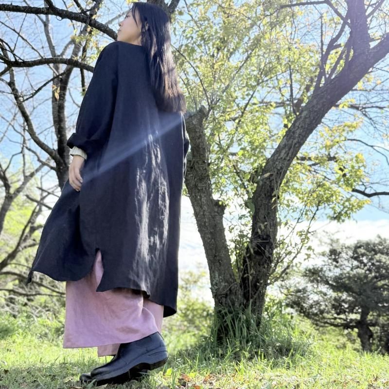 ノーカラーロングシャツワンピース フレンチリネン ブラック