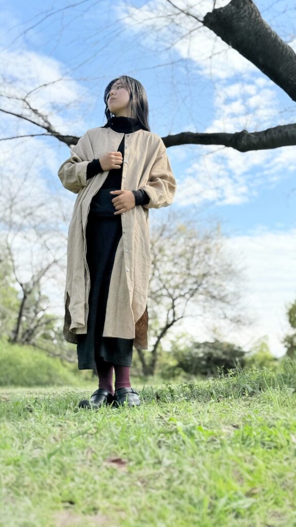 「重ねるほどに、美しく。」 首元をすっきりと見せるノーカラーのデザインは、季節に合わせた重ね着の楽しみを教えてくれます。ボタンをすべて閉じれば上品なドレスとして、開ければ軽やかなローブとして。フレンチリネンのベージュが持つ「包容力」を最大限に活かしたこの一着は、ワードローブの核となり、長く寄り添い続けることでしょう。