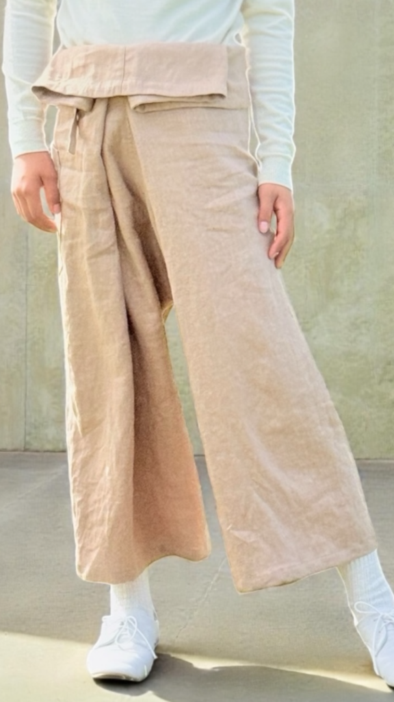 「自分に合わせる、自由。」 既製品のサイズ感に自分を合わせることに、疲れていませんか?このタイパンツは、大判の布を身体に巻きつけるという、理にかなった構造をしています。ウエストの位置も、裾の広がりも、その日の体調や気分に合わせて自在に。部屋着としてのリラックス感と、お出かけ着としての凛とした佇まい。その両方を、この一枚が叶えます。