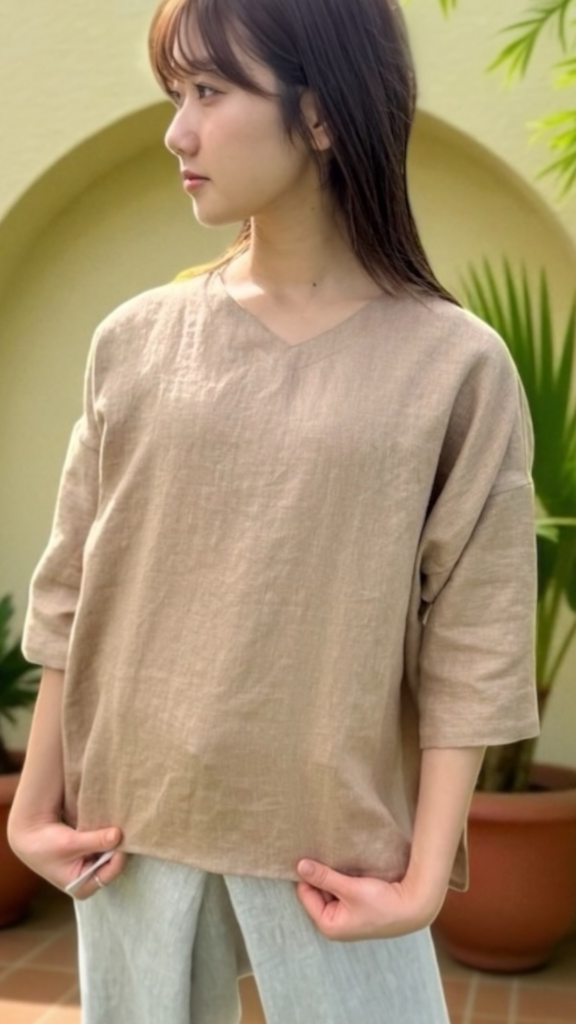 「肩まわりの窮屈さ、さようなら。」 身頃と袖をひとつづきにしたドルマンスリーブは、肩や脇のラインを意識させない「解放の形」です。大きなポケットはスマートフォンも余裕で収まる実用性を備えています。一枚で着れば主役に、羽織りものとして使えば名脇役に。着るほど肌に馴染むフレンチリネンの風合いが、もっとも色濃く感じられる一着です。